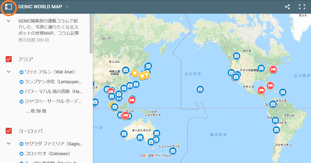 左上のマーク(上記画像上でオレンジの〇がついている)を押すと、登録されているスポットが大陸ごとに確認可能です。
